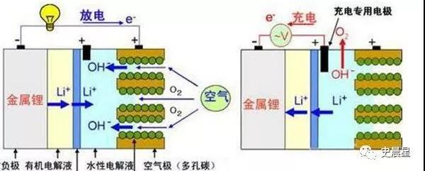 技術原理:以純氧氣為正極,以金屬鋰/鋁為負極,放電及充電時分別發(fā)生金屬鋰的氧化及還原反應,具有高達11500Wh/kg的理論能量密度