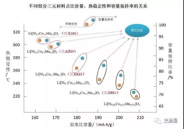 三元正極材料通過NiCo-Mn/Al的協(xié)同作用,結合了鈷酸鋰循環(huán)性能好,鎳酸鋰高比容量和錳酸鋰成本低安全性能好的優(yōu)點。在三元材料的各個組分中鎳決定電量,鈷決定充放電速度,錳決定穩(wěn)定性,隨著鎳含量的增加,電池的放電比容量也隨之增加,熱穩(wěn)定性和容量保持率有所降低,但隨著三元電池安全性得到提高與工藝演進,更高鎳三元材料是大勢所趨。