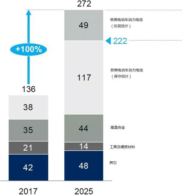 報告顯示,與2017年相比,2025年全球因電動汽車普及而對精煉鈷的需求最高將翻一倍。屆時,全球因電動車動力電池帶來的精煉鈷需求將超過總需求量的一半。分析師也曾表示,2016年中國來自電池領域(包括3C電池)的鈷需求就超過了80%。