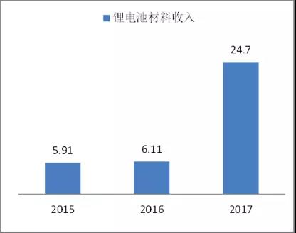 數(shù)據(jù)顯示,2015-2017年,寧德時代鋰電池材料收入分別為5.91億元、6.11億元和24.7億元。分別占據(jù)總營收的10.44%、4.18%和12.91%。