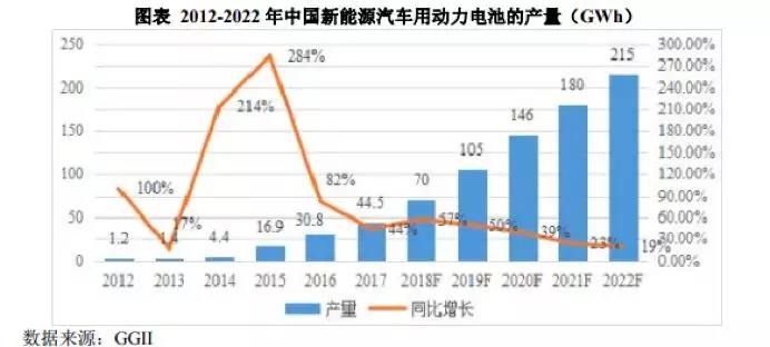 2017 年中國新能源汽車銷量 77.7 萬輛,同比增長 53.25%,連續(xù)三年位居全球最大的新能源汽車產(chǎn)銷市場。這一年中國汽車動力鋰電池產(chǎn)量為44.5GWh,同比增長 44.5%。高工產(chǎn)研鋰電研究所GGII預(yù)計到2022 年中國汽車動力鋰電池產(chǎn)量將達到 215GWh,同比 2017 年增長 3.8倍。