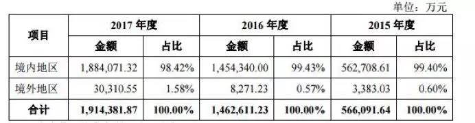 目前動力電池系統(tǒng)銷售仍是寧德時代的主要收入來源,近三年其動力電池系統(tǒng)銷售收入分別49.81億、139.76億、166.57億,占主營業(yè)務(wù)收入的比例分別為87.98%、95.55%和 87.01%。從區(qū)域來看,海外市場份額由0.60%提升至1.58%。