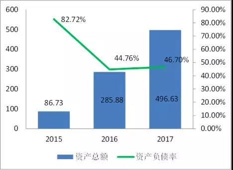 三年來,公司資產(chǎn)總額從 86.73 億元增長至496.63 億元,資產(chǎn)負(fù)債率從82.82%下降至46.70%。