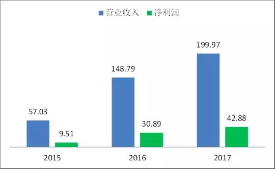 2015 年、2016 年及 2017 年,寧德時代營業(yè)收入分別為 57.03 億元、148.79億元及 199.97 億元,年均復(fù)合增長率 87.26%;凈利潤分別9.51 億元、30.89 億元及 42.88 億元,年均復(fù)合增長率高112.39%。