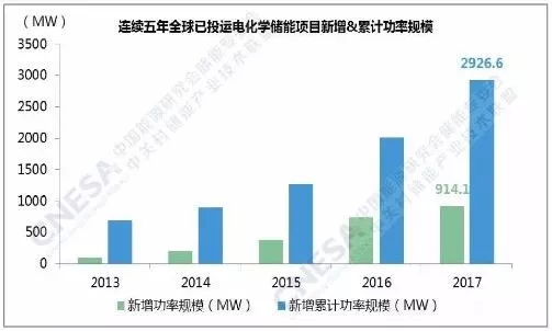 據(jù)儲(chǔ)能聯(lián)盟的不完全統(tǒng)計(jì),截至2017年底,全球已投運(yùn)儲(chǔ)能項(xiàng)目累計(jì)裝機(jī)規(guī)模為175.4GW。其中,抽水蓄能的累計(jì)裝機(jī)占比最大,為96%,較上一年下降1個(gè)百分點(diǎn)。電化學(xué)儲(chǔ)能項(xiàng)目的累計(jì)功率規(guī)模為2926.6MW,占比1.7%,較上一年增長(zhǎng)0.5個(gè)百分點(diǎn)。2017年,全球新增投運(yùn)電化學(xué)儲(chǔ)能項(xiàng)目的功率規(guī)模為914.1MW,同比增速超過(guò)20%。