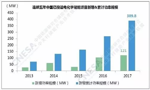 據(jù)儲(chǔ)能聯(lián)盟的不完全統(tǒng)計(jì),截至2017年底,中國(guó)已投運(yùn)儲(chǔ)能項(xiàng)目累計(jì)裝機(jī)規(guī)模為28.9GW。其中,抽水蓄能的累計(jì)裝機(jī)占比最大,接近99%,電化學(xué)儲(chǔ)能項(xiàng)目的累計(jì)裝機(jī)規(guī)模緊隨其后,為389.8MW,占比為1.3%,較上一年增長(zhǎng)0.2個(gè)百分點(diǎn)。2017年,中國(guó)新增投運(yùn)電化學(xué)儲(chǔ)能項(xiàng)目的功率規(guī)模為121MW,同比增速超過(guò)15%。