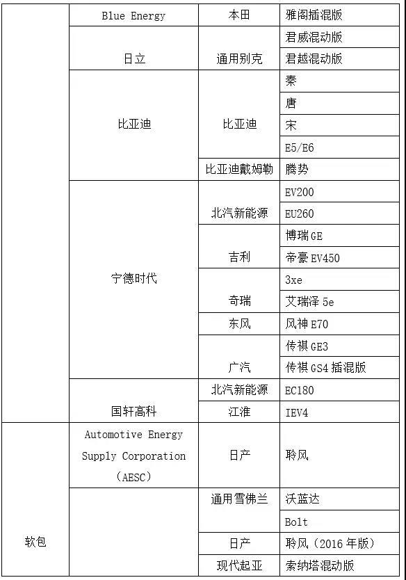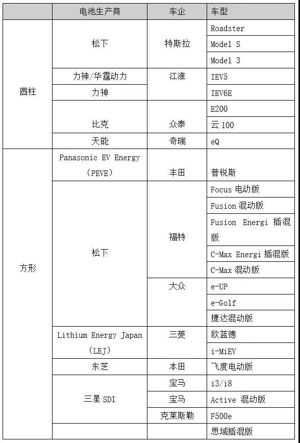 在汽車生產(chǎn)商和電池制造商的長期磨合中(也可能是車廠自己造電池),不少企業(yè)都形成了自己比較擅長的電池封裝路線,下表列出了全球主要新能源汽車車型應(yīng)用的電池類型。