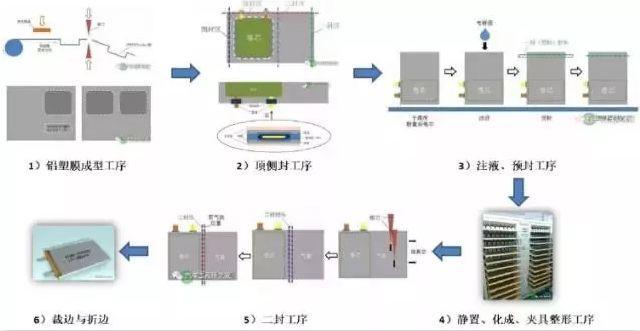 軟包鋰離子電芯主要包括:鋁塑膜成型、頂封與側(cè)封、注液與預(yù)封、化成與整形、排氣與二封、裁邊與折邊。