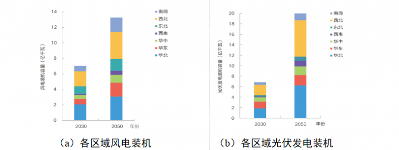 圖8 電氣化加速情景下各區(qū)域風電與光伏發(fā)電裝機容量