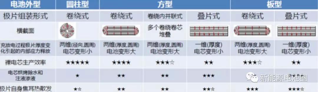電芯從正負極材料的角度來看目前有NCM(111,523,622,811),LCO,LFP,LMO,LTO等。車企要從能量密度,功率特性,循環(huán)壽命和安全性的維度進行篩選。另外從電池封裝形狀上又可分為圓柱,軟包(疊片和卷繞),方形(疊片,卷繞,并聯(lián)卷繞)。各個類型的電芯主要特點總結(jié)如下: