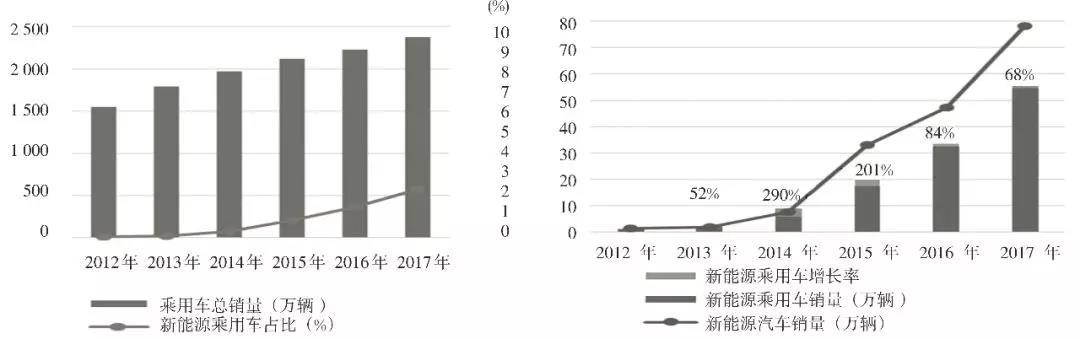 在全國(guó)整個(gè)乘用車銷售市場(chǎng)中,近年來(lái)傳統(tǒng)燃油乘用車的銷量穩(wěn)步增長(zhǎng),從 2012 年到 2017 年均增長(zhǎng)率為 9%。新能源乘用車在 2013~2015 年經(jīng)歷了爆發(fā)式增長(zhǎng),從 2012 年的銷量不足 1 萬(wàn)輛,到 2015 年的年銷量已經(jīng)超過(guò) 17 萬(wàn)輛,再到 2017 年全年銷量已接近 55 萬(wàn)輛。每年的增長(zhǎng)率都超過(guò) 50%。從銷量數(shù)據(jù)上來(lái)看,新能源乘用車銷量占全國(guó)乘用車銷售比例從 2012 年占比不足 0.7%,到 2017 年銷量超過(guò) 2.3%。(詳見(jiàn)圖 3)