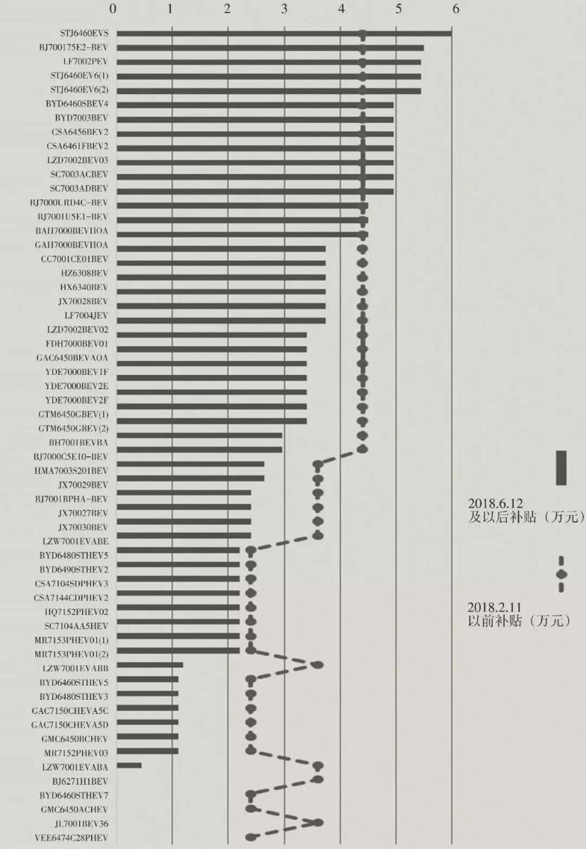 本文根據(jù)新規(guī)對(duì) 2018 年前兩批推薦新能源乘用車車型進(jìn)行試算,分析比對(duì)同一車型在 2018 年 2 月 12 日以前與 2018 年 6 月11 日以后的補(bǔ)貼變化。詳見(jiàn)圖 1,左側(cè)縱軸顯示車型,上方橫軸 0~6 為單車補(bǔ)貼金額(單位:萬(wàn)元)。