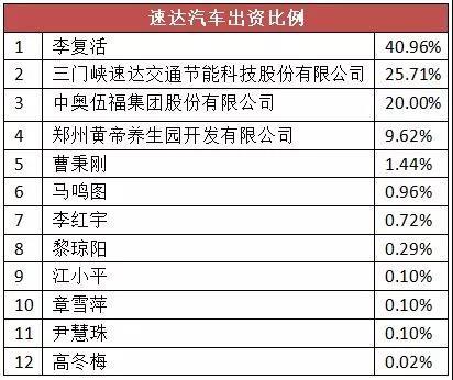 目前的工商信息顯示,速達汽車董事長李復(fù)活持有超4成股權(quán)。而第二大股東三門峽速達交通節(jié)能科技股份有限公司(速達科技,新三板上市公司),也是李復(fù)活實際控制的公司,持有近四分之一股份。兩項相加,李復(fù)活持有近65%股份。