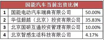 國能汽車(國能新能源汽車有限責(zé)任公司,下稱國能新能源)是國能汽車技術(shù)開發(fā)有限責(zé)任公司100%控股公司。而國能汽車技術(shù)開發(fā)公司,目前有四大股東,分別是國能瑞典、華信超越、國研互通和北京智感生活科技有限公司。