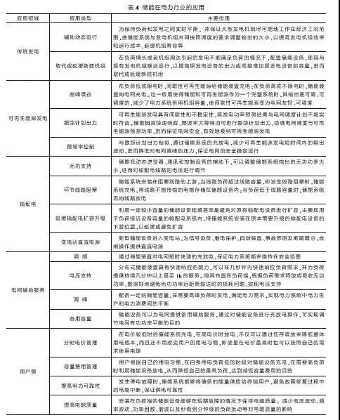 具體來說,儲能技術在電力行業(yè)發(fā)、輸、配、用的各個環(huán)節(jié)均有不同的應用,見表4。在發(fā)電端,傳統(tǒng)發(fā)電領域可以進行輔助動態(tài)運行、取代或延緩新建機組;在可再生能源發(fā)電領域主要用于削峰填谷、跟蹤計劃出力和爬坡率控制;在輸配電領域的主要應用包括無功支持、環(huán)節(jié)線路阻塞、延緩輸配電擴容升級以及作為變電站直流電源;在電網(wǎng)輔助服務領域的主要應用包括調頻、電壓支持、調峰和作為備用容量;同時,儲能技術在用戶側可以用于分時電價與容量費用管理,提高電力可靠性和電能質量等。