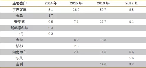 圖17:2014年~2017年1~6月寧德時(shí)代前五大客戶(單位:萬(wàn)元)