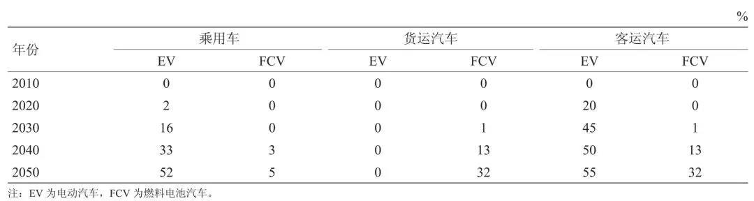 隨著新能源汽車技術進步、成本下降及基礎設施的不斷完善,新能源汽車市場份額將快速增長,電動汽車將逐步替代部分乘用車和大型客車,燃料電池汽車將逐步替代部分乘用車和部分大型客運和貨運汽車。如果新能源汽車得到大力發(fā)展,根據(jù)模型測算結(jié)果, 2020 年、 2030 年、 2050 年將可分別替代成品油 9.33 × 10^6 toe、 5.71 × 10^7 toe、 1.87 × 10^8 toe 左右。新能源汽車大力發(fā)展時的占比,如表 1 所示。