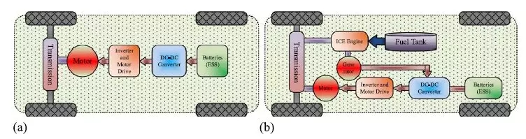 圖2. EV架構(gòu):a)電池供電的EV和b)串并聯(lián)全HEV