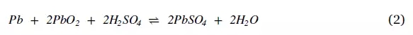 3.2.2.1 鉛酸電池。自1860年以來,鉛酸電池一直被用作商業(yè)能源 [45]。LA電池常見的用法是每臺(tái)內(nèi)燃機(jī)(ICE)車輛起動(dòng)電源,由于其堅(jiān)固耐用,運(yùn)行安全,溫度耐受性好和低成本,通??捎糜趹?yīng)急電源,可再生能源儲(chǔ)存和電網(wǎng)調(diào)峰 [15,30]。電池由Pb作為負(fù)極,PbO2 作為正極,H2SO4 作為電解質(zhì)[14,58]。發(fā)生在LA電池中的電化學(xué)反應(yīng),如方程 (2)。