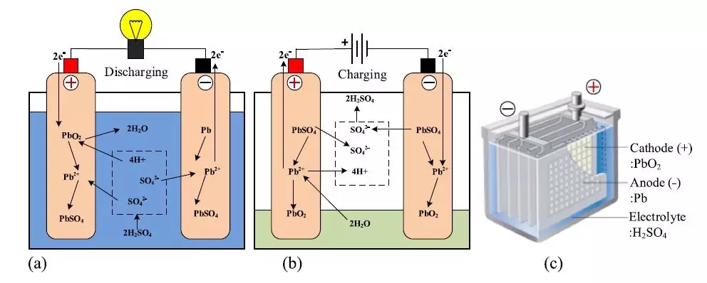 圖 6. 鉛酸電池化學(xué):( a )放電期間,( b )充電期間和( c ) LA 電池原型 [14,30] 。