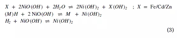 鎳基電池利用氫氧化鎳作為正極,負(fù)極材料。根據(jù)有多種。根據(jù)負(fù)極材料額種類不同,鎳基電池可以分為:鎳-鐵,鎳-鎘,鎳-鋅,鎳氫,和Ni-H2 [3,14,30,45,62] 。通常,在鎳基電池中,活性材料羥基氧化鎳作為正極,氫氧化鉀作為電解質(zhì),金屬Fe/Cd/Zn,MH或H2 材料作為負(fù)極 [14]。發(fā)生在鎳基電池中的整體電化學(xué)反應(yīng)式(3):