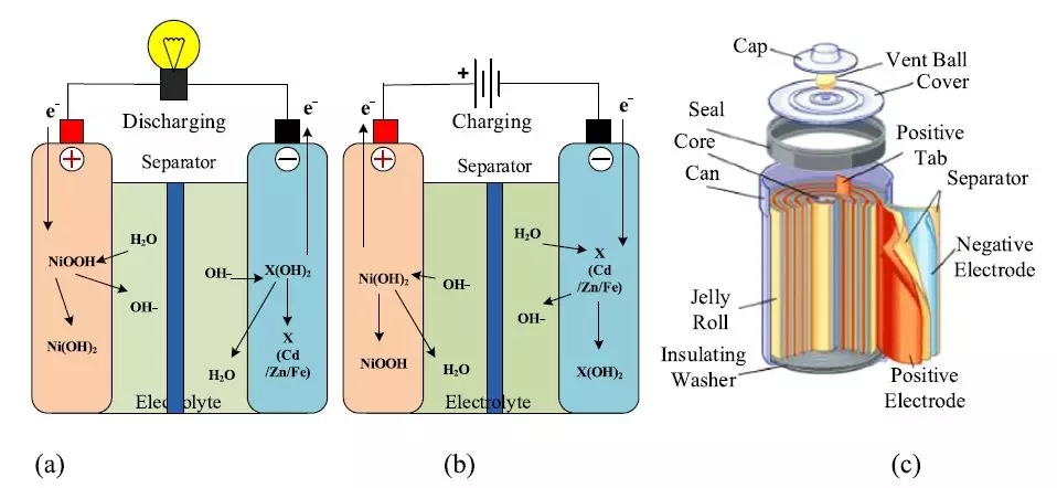 圖 7. 鎳基電池化學(xué)。( a )放電期間,( b )充電期間,和( c )鎳基電池原型 [14,30,45,62] 。