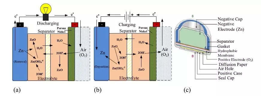 圖 9. 鋅空氣電池化學(xué)成分:( a )放電期間,( b )充電期間和( c )鋅空氣電池原型 [83] 。