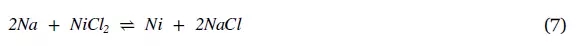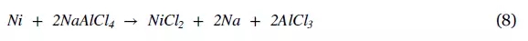 兩種鈉-β電池之間的主要區(qū)別是額外使用的鹽酸鋁鈉(NaAlCl4)作為第二電解質(zhì)[45]。ZEBRA電池的活性材料是熔融鈉作為陽極,固體β-氧化鋁陶瓷作為主要電解質(zhì),熔融鹽酸鋁鈉(NaAlCl4)作為輔助電解質(zhì),以及多孔金屬氯化物(MeCl2)作為陰極[14]。金屬氯化物可以是氯化鎳(NiCl2),氯化鐵(FeCl2)或氯化鎳鐵(Ni-FeCl2)的組合。在Na-S電池中的整個(gè)電化學(xué)反應(yīng)如方程 (7)。