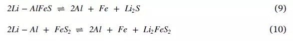鋰電池有專為高溫環(huán)境應(yīng)用設(shè)計(jì)的品類。除了鈉-β電池,鋰-鋁-鐵(鋰-鋁- FES)和鋰-鋁-鐵(鋰-鋁-的FeS2)都是高溫鋰電池[14,45,59]。這些鋰硫電池在所有鋰電池中具有最高的能量容量。但此類鋰電池循環(huán)壽命短[3],需要熱管理,并且由于需要維持工作溫度會(huì)造成大量能量損失[14]。鋰硫電池的操作溫度范圍375-500℃ [14,45]。高溫鋰-硫電池由鋰鋁合金作為陽極,鐵硫化物為陰極,熔融的鋰氯化物氯化鉀作為電解質(zhì)和隔膜[14,59] 。在這些電池中,鋰-Al合金被用于控制鋰的活性,和鐵硫化物用于防止鐵的腐蝕[14,59] 。在兩種鋰硫電池類型中,總體電化學(xué)反應(yīng)如方程(9)和(10)所示。