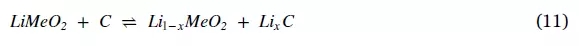 鈷酸鋰電池是被開發(fā)的第一個(gè)類型。氧化鈷是比,鎳和錳等元素都要昂貴的元素,后者更具有價(jià)格優(yōu)勢(shì) [94] 。LiFePO4 電池功率密度高,并且在所有鋰離子電池中成本最低[3,92]。LiFePO4 電池在熱穩(wěn)定性好,化學(xué)性能穩(wěn)定性好[3],因此能夠廣泛應(yīng)用于電動(dòng)汽車。由于Li4Ti5O12 電池比其他鋰電池充電更快,在電動(dòng)汽車中也有應(yīng)用[3]。鋰離子電池由作為陰極的鋰金屬氧化物(LiMeO2,例如LiCoO2,LiMn2O4,LiFePO4,LiNiMnCoO2,LiNiCoAlO2和Li4Ti5O12),有機(jī)碳酸鹽作為電解質(zhì),鋰化石墨碳作為陽極,以及隔膜組成[45,65,84,86,94,95]。鋰離子電池的整體電化學(xué)反應(yīng)如式(11)所示。