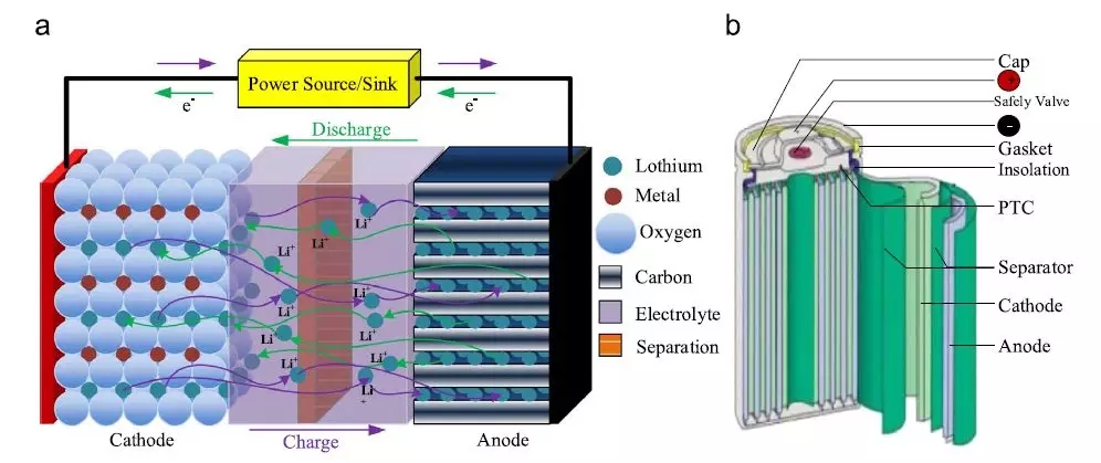 圖 12. 鋰離子電池的化學(xué)特性:( a )在放電和充電過程中和( b )鋰離子電池的圓柱視圖 [31,45,84,95] 。