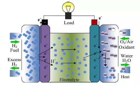 圖14 顯示了簡單的氫燃料電池化學(xué)反應(yīng)過程[14,46,58] 。注入的氫燃料通過在燃料電極的催化表面上解離,形成氫和電子。氫離子通過電解質(zhì)到達(dá)氧電極的催化表面。同時(shí),電子通過外部電路移動(dòng)給負(fù)載供電。在其他電極的外側(cè),水通過氫離子,氧和電子結(jié)合而產(chǎn)生 [45] 。在再生閉環(huán)過程中,電源電解器將水分離成氫氣和氧氣再次供給電池,從而產(chǎn)生電力和水,這個(gè)閉環(huán)只需要電力就可以反復(fù)循環(huán) [45] 。