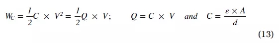 存儲(chǔ)在電容器中的能量與其電容成正比,并與電極兩端的電壓成正比,隨著電極表面積和電介質(zhì)材料介電常數(shù)的增加,電極間距離的減小,容量增加,并且隨著電極,數(shù)值關(guān)系如方程 (13)所示[14,15,33,58]。
