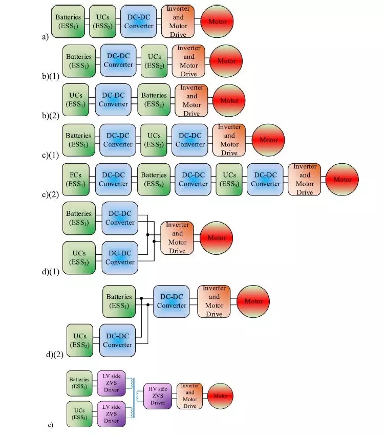 圖18. HSS的結(jié)構(gòu):a)兩個(gè)并聯(lián)的ESS(無源),b)一個(gè)串聯(lián)的雙向DC-DC轉(zhuǎn)換器; c)兩個(gè)串聯(lián)的雙向DC-DC轉(zhuǎn)換器,d)兩個(gè)并聯(lián)的兩個(gè)雙向DC-DC轉(zhuǎn)換器,以及e)多輸入ZVS雙向DC-DC轉(zhuǎn)換器。