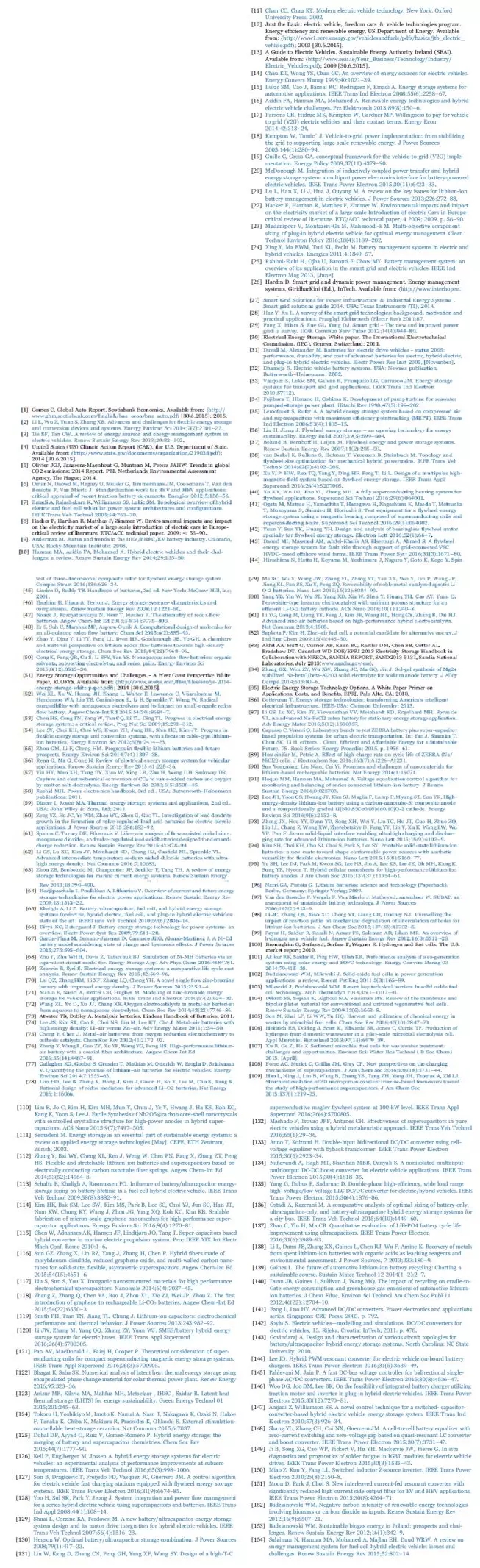 就結(jié)構(gòu)和功能而言,UC與普通電容器類似。然而,UC可以具有高容量,其值為千法拉[3,33],被稱為超級(jí)電容器。UC的比功率約1000 - 2000W/kg,能量效率95% [3,14,46,108 - 111] 。在所有ESS中,UC擁有最長壽命,近40年。由于UC具有高功率存儲(chǔ)功能,在電動(dòng)汽車中被用于滿足大功率需求; 它不需要維護(hù),而且溫度不敏感,操作時(shí)間長[3,14,111]。用于快速充電和放電,在電動(dòng)制動(dòng)能量回收過程中,UCs被用作能量存儲(chǔ)器,并且為急速加速需要的能量來源[63,108-111]。