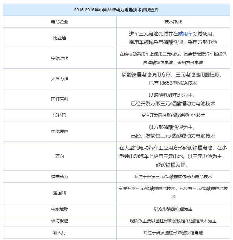 2015-2016年中國品牌動力電池技術(shù)路線選擇