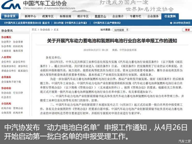 2018年4月27日,中汽協(xié)官方網(wǎng)站發(fā)布了《關(guān)于開展汽車動力蓄電池和氫燃料電池行業(yè)白名單申報工作的通知》,通知指出:將由中國汽車動力電池產(chǎn)業(yè)創(chuàng)新聯(lián)盟組織實施《汽車動力蓄電池和氫燃料電池行業(yè)白名單暫行管理辦法》,并接受工信部等有關(guān)部門的指導(dǎo)、監(jiān)督。