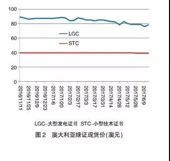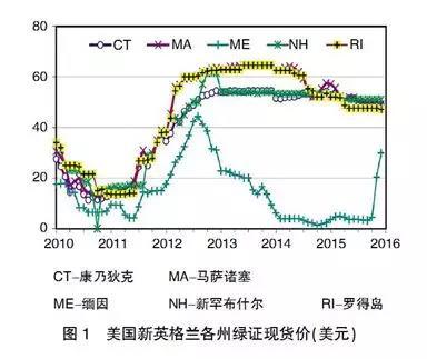 各國(guó)綠證交易價(jià)格主要受證書(shū)供需形勢(shì)影響,同時(shí)也與可再生能源發(fā)電技術(shù)類(lèi)型、季節(jié)波動(dòng)、監(jiān)管懲罰強(qiáng)度等多種因素相關(guān),具有較大的差異性和波動(dòng)性。從美國(guó)新英格蘭地區(qū)各州的綠證現(xiàn)貨價(jià)格來(lái)看,馬薩諸塞、羅得島、康乃狄克和新罕布什爾州的綠證供應(yīng)在2013~2015年期間供應(yīng)偏緊,單位綠證的交易價(jià)格達(dá)50~60美元,而同期的緬因州由于生物質(zhì)發(fā)電計(jì)入綠證核發(fā)范圍、綠證供應(yīng)顯著高于需求,價(jià)格降至10美元以下。澳大利亞大型發(fā)電技術(shù)證書(shū)價(jià)格因供應(yīng)增加,自2016年下半年以來(lái)震蕩下行,但截至2017年6月仍高于75澳元;小型技術(shù)證書(shū)則主要受限價(jià)、罰款等因素影響,一直保持在最高限定價(jià)格40澳元附近。此外,從部分國(guó)家和地區(qū)的交易市場(chǎng)來(lái)看,風(fēng)電由于成本和價(jià)格較低在早期時(shí)是綠證交易主體,太陽(yáng)能發(fā)電由于價(jià)格快速下降、有取代風(fēng)電成為交易主體的趨勢(shì)(見(jiàn)圖1、圖2)。