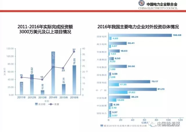 行業(yè)報告顯示,2016年,大型電力企業(yè)對外投資項目、新簽對外承包及年底在建合同額均較上年有所增長?!耙粠б宦贰背蔀橥顿Y亮點。我國電力企業(yè)已在52個“一帶一路”沿線國家開展投資業(yè)務(wù)和項目承包工程,其中大型承包項目120個、涉及國家29個、合同金額275億美元。