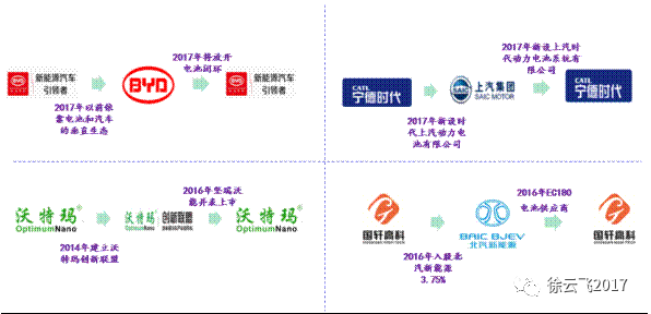 拓展客戶模式是關鍵。產(chǎn)能快速擴張下預計全行業(yè)2017年產(chǎn)能利用率同比去年40%的均值將回落,產(chǎn)業(yè)巨頭加速跑馬圈地,年內(nèi)的規(guī)劃出貨量目標較高,拓展客戶成為產(chǎn)能有效釋放的關鍵,憑借供應優(yōu)勢2016年龍頭企業(yè)產(chǎn)能利用率高于均值(比亞迪和CATL都在90%以上),動力電池企業(yè)紛紛采取策略拓展客戶綁定,模式更加多元化:1)參股車企,深度綁定。2)聯(lián)盟模式,共同拓展市場。3)合資建廠,實現(xiàn)利益共贏。