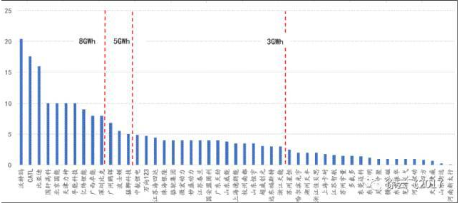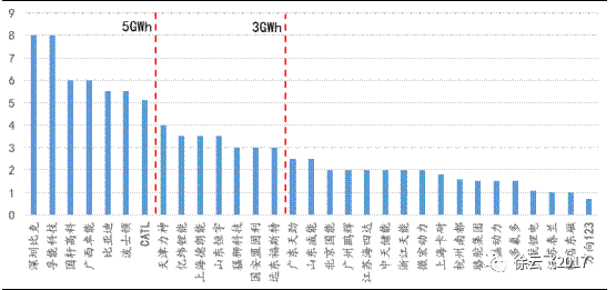 從產(chǎn)能格局來看,龍頭企業(yè)基本上沒有大的變化,沃特瑪(20.4GWh)、CATL(18GWh)、比亞迪(16GWh)繼續(xù)位列前三,國軒高科、波士頓、北京國能、天津力神、孚能科技緊隨其后。