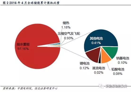 截至2016年4月,全球儲能總裝機容量為145.92吉瓦,其中抽水蓄能為142吉瓦,占全部裝機容量的97.16%,化學電池儲能只占了總裝機容量的不到1%。