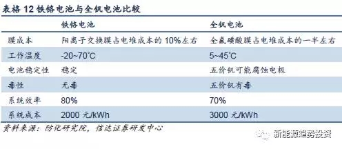 與全釩電池相比,鐵鉻電池有其獨到的優(yōu)勢,其中陽離子交換膜成本低是其最突出的特點,相比全釩電池的膜成本占電堆成本的約1/2,鐵鉻電池的膜成本只占電堆成本的10%。同時工作溫度廣,電池更穩(wěn)定。目前已有公司可以將鐵鉻電池系統(tǒng)成本降到2000元/kWh以下,有一定成本優(yōu)勢,但是由于尚未規(guī)?;瘧?,技術(shù)有效性尚需進行實際驗證。