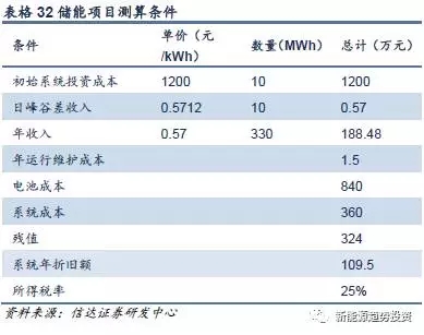 由于目前實際應用中儲能大多用于削峰填谷,我們以10MWh的鉛炭電池用于削峰填谷來進行投資回報的測算。目前初始的系統(tǒng)成本在1200元/kWh左右,項目運行假設如下: