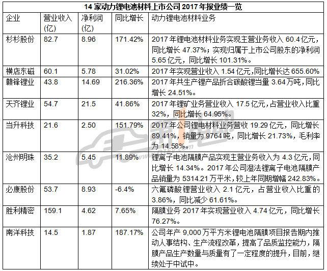 中國儲(chǔ)能網(wǎng)訊:在政策利好的刺激下,近年來新能源汽車市場(chǎng)大熱,作為新能源汽車的核心零部件,動(dòng)力電池及上下游產(chǎn)業(yè)鏈?zhǔn)芤骘@著。在“漲”聲一片的行業(yè)背景下,2017年鋰電池材料上市企業(yè)業(yè)績(jī)?nèi)绾危?