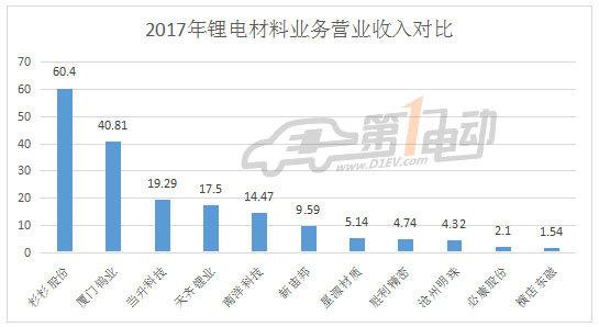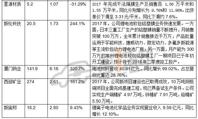 動(dòng)力鋰電池材料業(yè)務(wù)方面,2017年,杉杉股份鋰電池材料業(yè)務(wù)實(shí)現(xiàn)主營(yíng)業(yè)務(wù)收入60.4億元,同比增長(zhǎng)47.37%。廈門鎢業(yè)電池材料營(yíng)收40.81億元,同比增長(zhǎng)99.02%,占總營(yíng)收比重達(dá)28.76%。當(dāng)升科技鋰電材料業(yè)務(wù)營(yíng)收19.29億元,同比增長(zhǎng)89.41%,銷量為9764噸,同比增長(zhǎng)21.73%。滄州明珠鋰離子電池隔膜產(chǎn)品實(shí)現(xiàn)主營(yíng)業(yè)務(wù)收入為4.3億元,同比增長(zhǎng)14.34%。勝利精密隔膜業(yè)務(wù)2017年實(shí)現(xiàn)營(yíng)業(yè)收入4.74億元,同比增長(zhǎng)76.27%。
