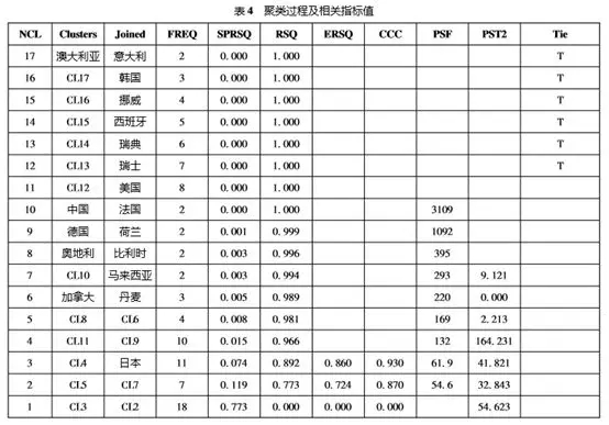 表4中,NCL為當(dāng)前系統(tǒng)存在類的總個(gè)數(shù),Clusters為當(dāng)前加入的編號(hào),Joined表示加入該類的國家,F(xiàn)REQ表示新類的元素個(gè)數(shù),SPRSQ表示類與類之間規(guī)格化最短距離,RSQ表示R2統(tǒng)計(jì)量,ERSQ表示偏R2統(tǒng)計(jì)量,CCC為統(tǒng)計(jì)量值,PSF為偽F統(tǒng)計(jì)量,PST2為偽T2統(tǒng)計(jì)量,Tie表示“節(jié)”。從CCC統(tǒng)計(jì)量可以看出,聚為3類時(shí)的值最大;若聚為4類,偽F統(tǒng)計(jì)量PSF和偽T2統(tǒng)計(jì)量都變化較大。綜合各方面的情況,聚為3類最為合適。