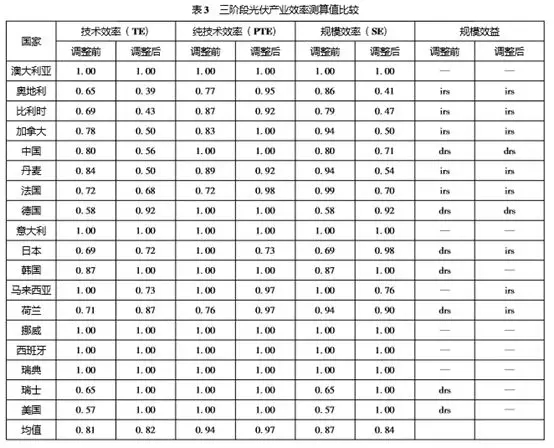 剔除外部環(huán)境因素和隨機(jī)誤差以后,7個(gè)國家的光伏產(chǎn)業(yè)技術(shù)效率有不同幅度的上升,說明這7個(gè)國家光伏產(chǎn)業(yè)所處的比較不利的環(huán)境因素限制了技術(shù)效率的提升,而不是較低的管理水平導(dǎo)致了低技術(shù)效率;5個(gè)國家的技術(shù)效率在調(diào)整前后均為1,保持不變,說明在這5個(gè)國家,光伏產(chǎn)業(yè)處于自身最優(yōu)的狀態(tài);6個(gè)國家的技術(shù)效率有所下降,說明這6個(gè)國家的技術(shù)效率在第一階段被高估。與調(diào)整前相比,調(diào)整后6個(gè)國家的純技術(shù)效率有明顯的上升,10個(gè)國家的純技術(shù)效率保持不變,說明大部分國家的純技術(shù)效率在第一階段并未被高估。而規(guī)模效率在調(diào)整后,8個(gè)國家呈現(xiàn)下降的趨勢(shì),說明這些國家規(guī)模效率在第一階段被高估,規(guī)模不經(jīng)濟(jì)是導(dǎo)致這些國家光伏產(chǎn)業(yè)效率低下的原因。