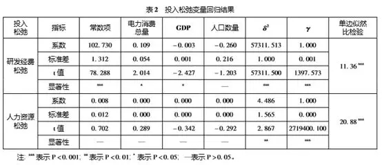 電力消費(fèi)總量對(duì)研發(fā)經(jīng)費(fèi)投入的松弛變量具有正向影響,說明電力消費(fèi)總量較大但也并不能有效增加行業(yè)內(nèi)創(chuàng)新資源的配置。原因在于,盡管行業(yè)的消費(fèi)需求量很大,帶動(dòng)了政府對(duì)行業(yè)創(chuàng)新給予較多的資金支持,但是獲得資金支持的企業(yè)可能對(duì)研究經(jīng)費(fèi)的管理較為粗放,造成浪費(fèi)。國內(nèi)生產(chǎn)總值和人口數(shù)量對(duì)研究經(jīng)費(fèi)松弛變量的影響為負(fù),說明經(jīng)濟(jì)實(shí)力的強(qiáng)度可以有效增進(jìn)光伏行業(yè)創(chuàng)新資源的配置。電力消費(fèi)總量、人口和GDP對(duì)于人力資源投入的松弛變量的影響并不顯著。