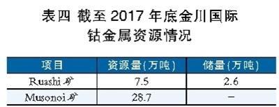金川國際是一家在香港上市的礦產(chǎn)資源開發(fā)與經(jīng)營商,主要開發(fā)經(jīng)營銅、鈷礦產(chǎn)品。 金川國際的核心資產(chǎn)位于剛果(金)和贊比亞,擁有高品質(zhì)的銅、鈷的4家礦區(qū)共8座礦山,擁有鈷金屬資源量為36.2萬噸(見表四)。